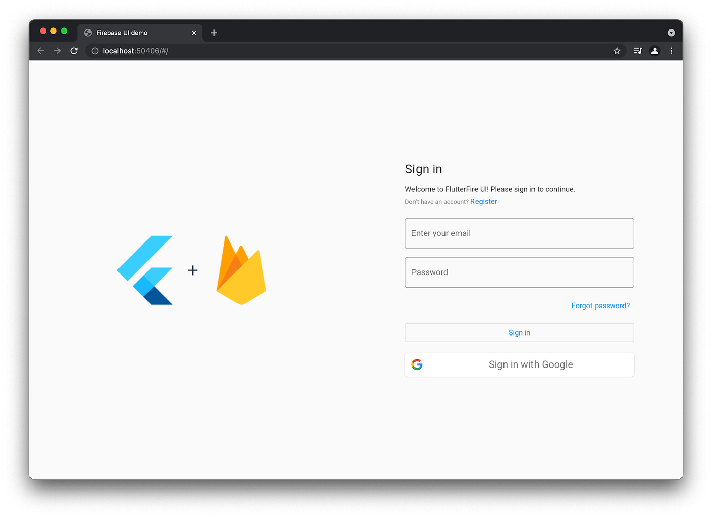 This screenshot shows the mobile version, but because the flutterfire_uiscreens are responsive, here’s what you get on a desktop device: