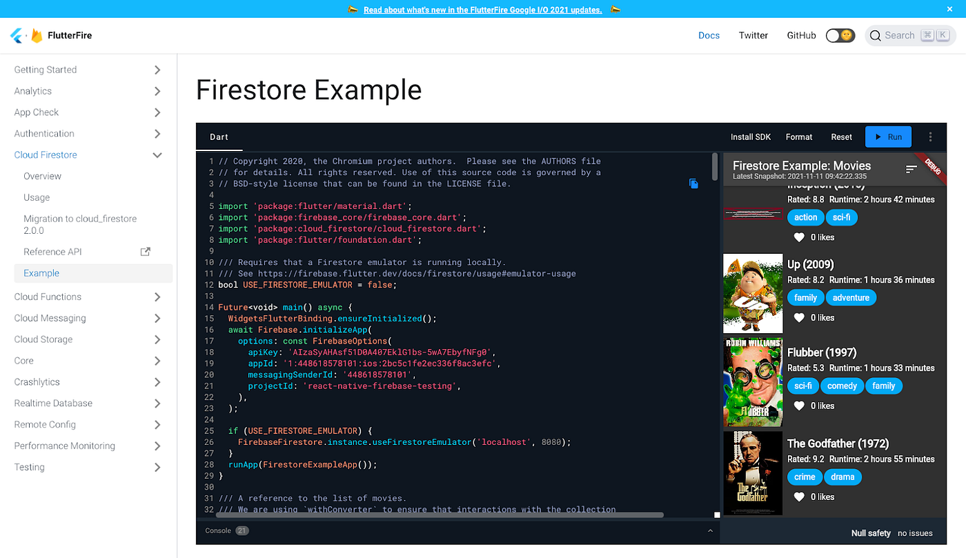 The other thing that FlutterFire support in DartPad enables is the ability to use an embedded instance of DartPad right in the docs.