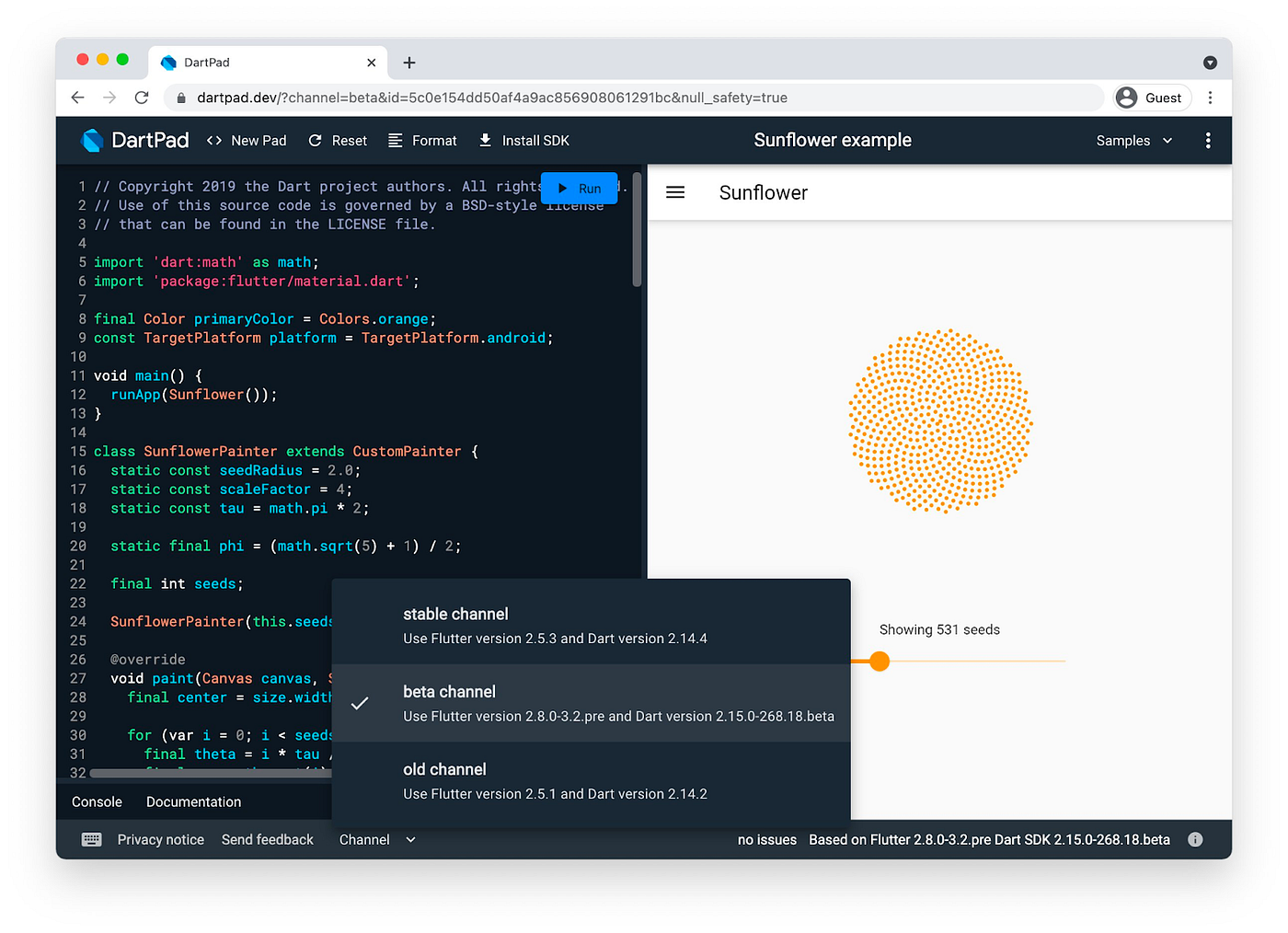 There’s another new DartPad feature that’s pretty handy, too. Previously, DartPad always ran the latest stable version. With this release, you can select the latest beta channel releases as well as the previous stable release (called the “old channel”), by using the new Channel menu in the status bar.