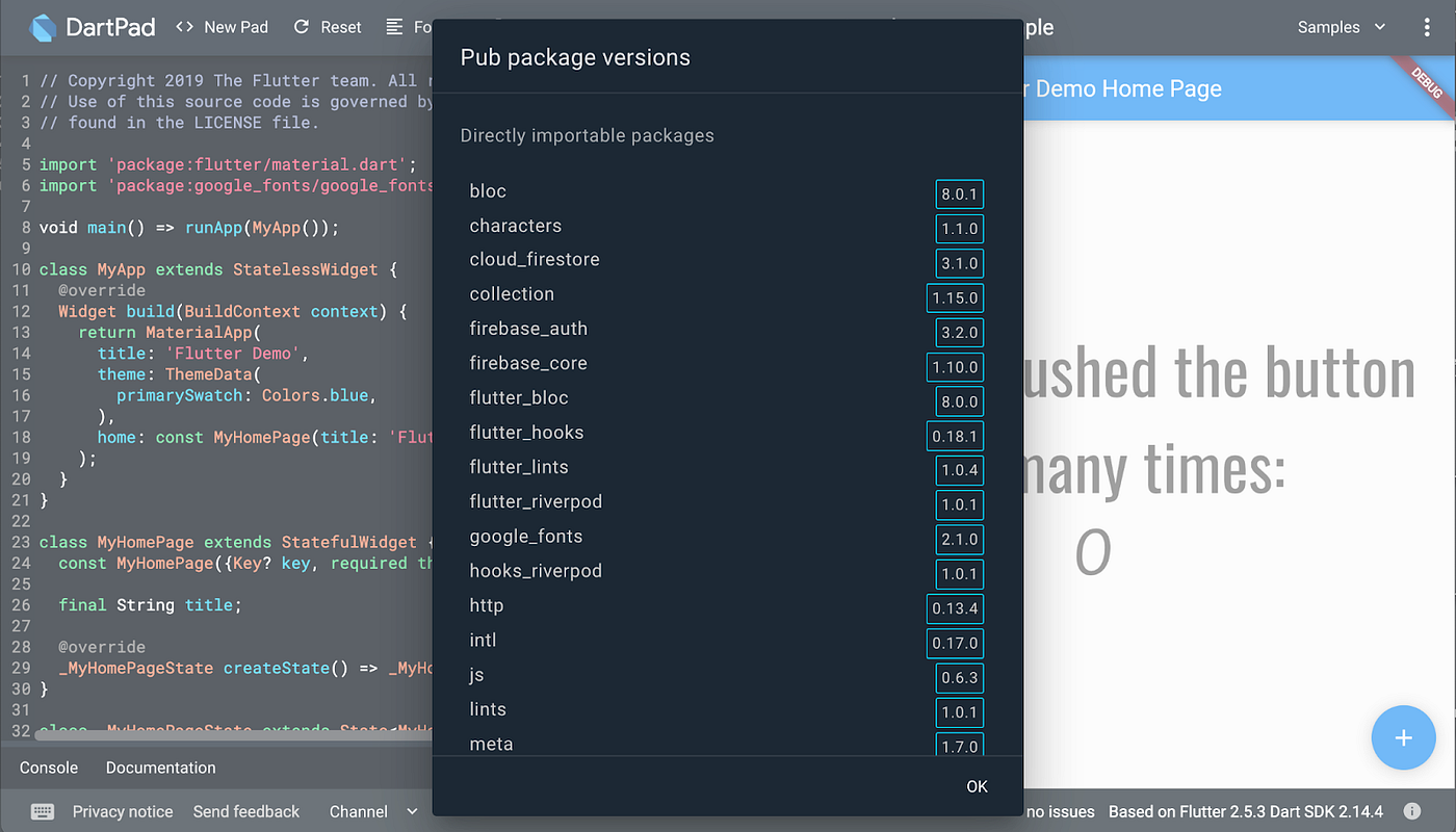 To learn the plan for adding new packages to DartPad over time, check out this article on the Dart wiki.