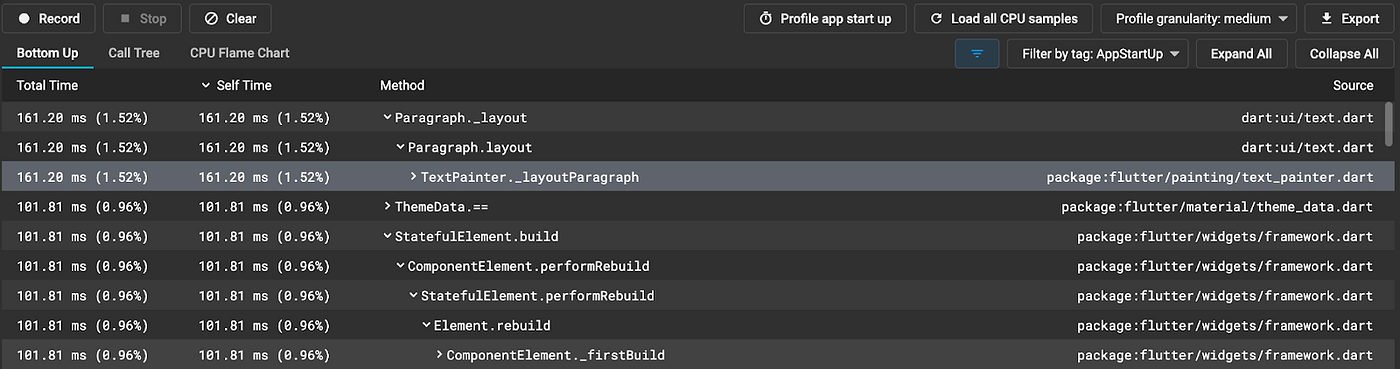 In addition, this release of DevTools adds new support for profiling the performance of your app’s startup. This profile contains CPU samples from the initialization of the Dart VM up until the first Flutter frame has been rendered. After you press the “Profile app start up” button and the app startup profile has been loaded, you will see that the “AppStartUp” user tag is selected for the profile. You can also load the app startup profile by selecting this user tag filter, when present, in the list of available user tags. Selecting this tag shows your profile data for your app’s startup.
